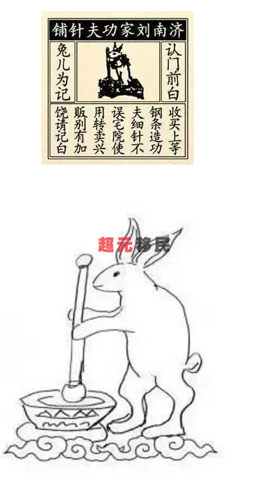 相比于现在五颜六色的商标标志,这件“白兔儿”商标显得很朴素,它采用雕版制作,中间是一只白兔拿着铁杵捣药,白兔上面印有一排字“济南刘家功夫针铺”,两边刻有“认门前白兔为记”,就是要民众认清楚商标重要依据。